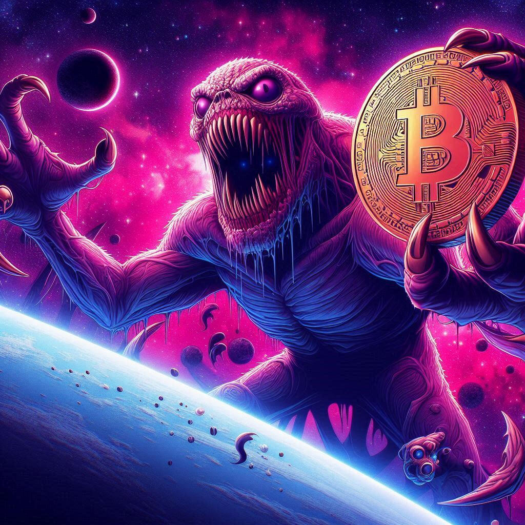 Deep in the vast reaches of space, where time bends and galaxies whisper, the Bitcoin Monsters have broken free from their digital chains. No longer bound to blockchains or earthly economies, they now drift through cosmic voids, searching for new frontiers to claim.