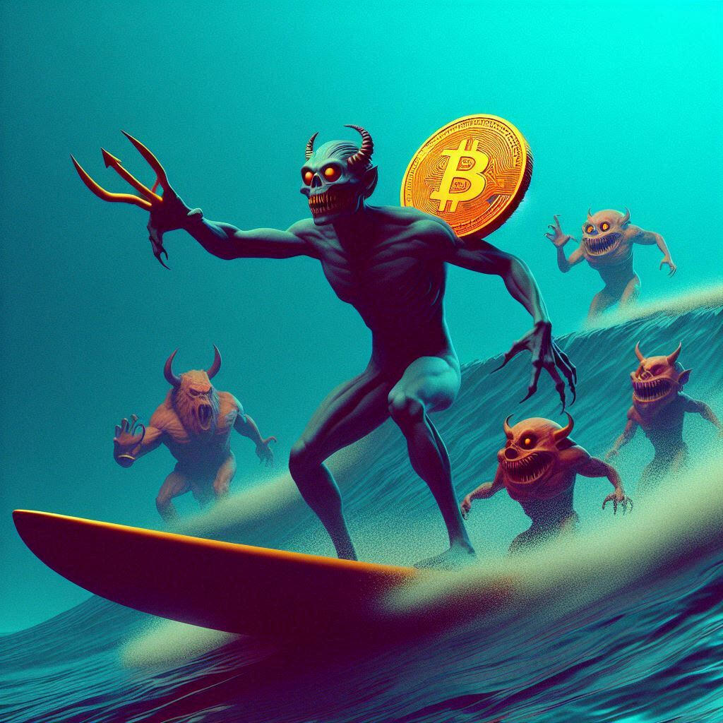 In the open sea, where the tides shift without warning, the Bitcoin Monsters combine speed, skill, and ruthless precision as they hunt while surfing across the waves. These creatures embody the thrill of chasing profits, knowing that only the fastest and most adaptable survive the volatile currents of the crypto world.Masters of fluid movement – Like expert traders reading market shifts, these monsters navigate the waves with unmatched agility, never missing an opportunity. Predators of the deep – With razor-sharp instincts, they hunt lost Bitcoin wallets and overlooked market entries, seizing hidden treasures before they vanish. Balancing risk and reward – The ocean is unforgiving, and every move must be calculated—just like in the crypto space, where one wrong call can lead to a wipeout.This collection is a powerful reflection of high-risk, high-reward decision-making, celebrating those who can ride the waves while seizing opportunities in the chaos.