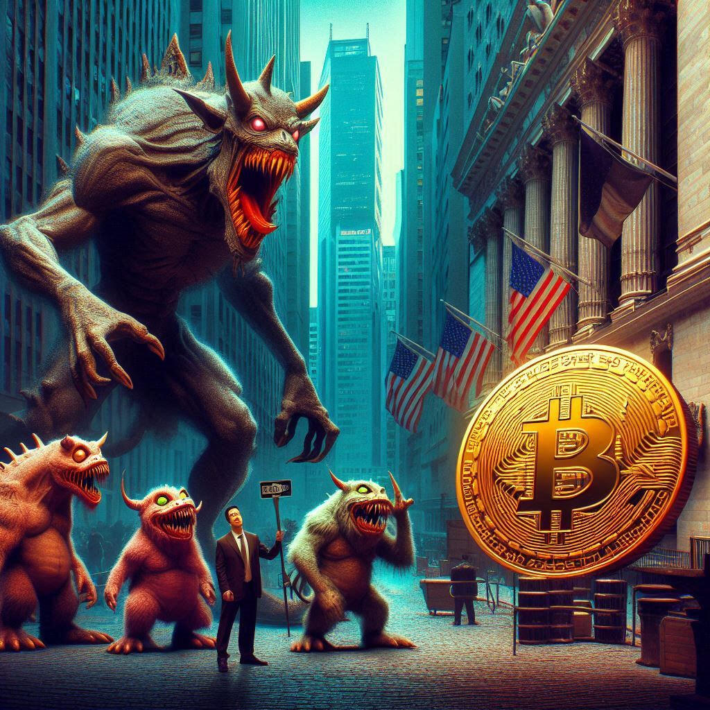Deep in the heart of New York’s financial district, where fortunes rise and fall in the blink of an eye, a new power has entered the game—one that no banker, broker, or hedge fund manager saw coming.At first, it was just a rumor—whispers of strange fluctuations in Bitcoin’s price, movements that made no sense even to the most seasoned analysts. Then came the malfunctioning stock tickers, numbers distorting in real-time, transforming into eerie monster-like glyphs.And now? The Bitcoin Monsters own Wall Street.On the floors of the New York Stock Exchange, screens flicker between cryptic blockchain codes and terrifying monster faces, each predicting the next market collapse. The charging bull statue now gleams with pixelated eyes, pulsating like a beating heart in tune with Bitcoin’s price shifts.Some traders swear they’ve seen shadowy figures moving through their terminals, manipulating trades before their very eyes. Others claim their portfolios have mysteriously converted into Bitcoin, without their consent, controlled by unknown digital forces.This is no financial crisis. This is a complete system override.Wall Street’s greatest players are scrambling to regain control, but the Bitcoin Monsters have rewritten the rules—and now, the market belongs to them.Will anyone survive the takeover? Or is the economy now just another battlefield for the Bitcoin Monsters?